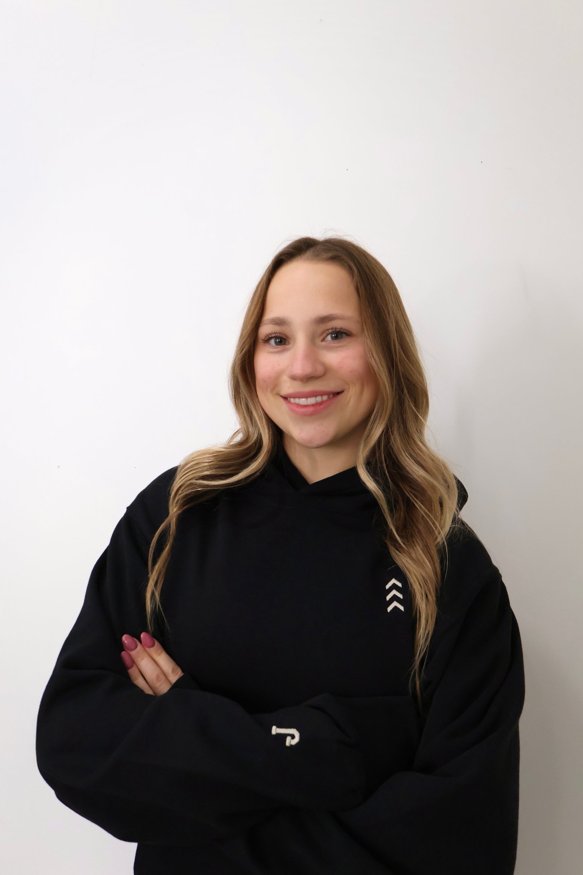Model with black hoodie wearing SMALL